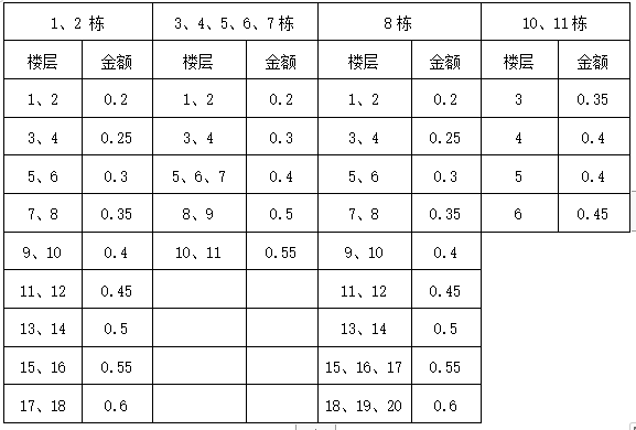 6.小區(qū)自2018年12月1日以來,按照每平方0.4元/月標(biāo)準(zhǔn)對小區(qū)居民征收電梯運(yùn)行維護(hù)費(fèi)。參考周邊小區(qū)電梯收費(fèi)標(biāo)準(zhǔn),經(jīng)業(yè)委會(huì)討論,自2019年12月起將電梯收費(fèi)標(biāo)準(zhǔn)按照樓層系數(shù)收取,相關(guān)收取標(biāo)準(zhǔn)如下(金額:元/月):