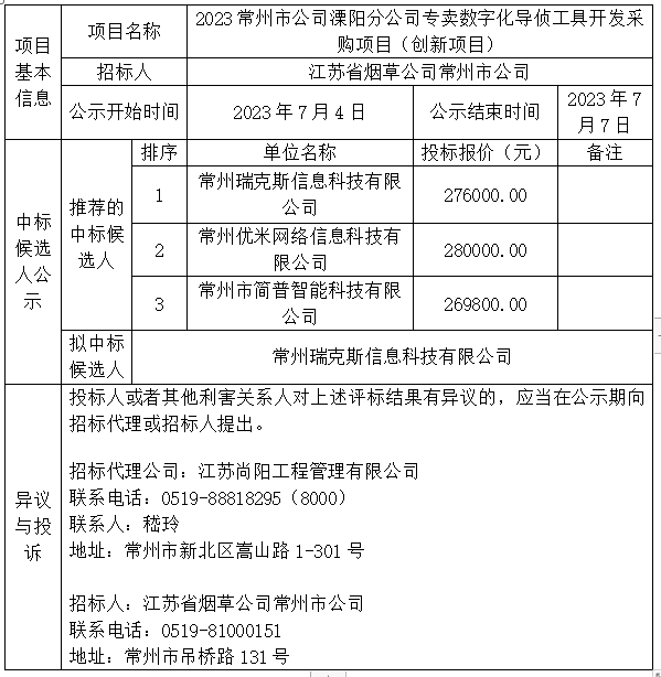 2023常州市公司溧陽分公司專賣數(shù)字化導(dǎo)偵工具開發(fā)采購項(xiàng)目(創(chuàng)新項(xiàng)目)中標(biāo)候選人公示