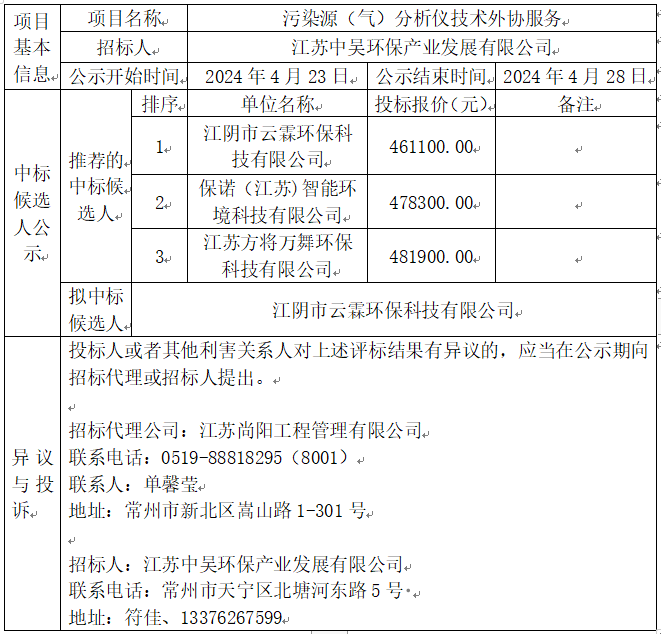 污染源(氣)分析儀技術(shù)外協(xié)服務(wù)中標(biāo)候選人公示