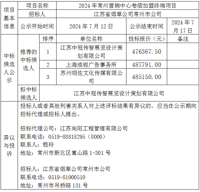 2024年常州營銷中心卷煙加盟終端項目中標候選人公示