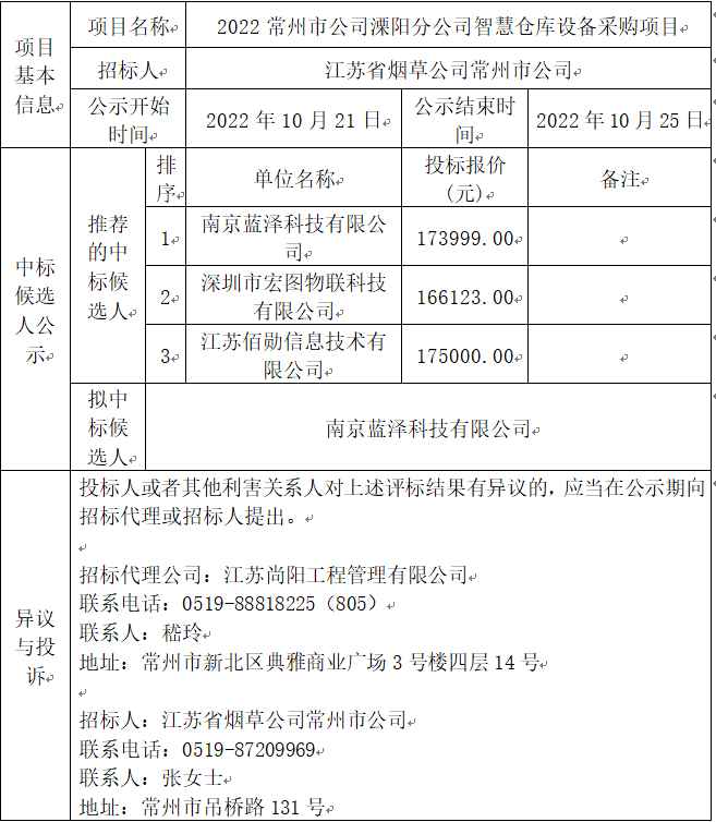 2022常州市公司溧陽分公司智慧倉庫設(shè)備采購項目中標候選人公示
